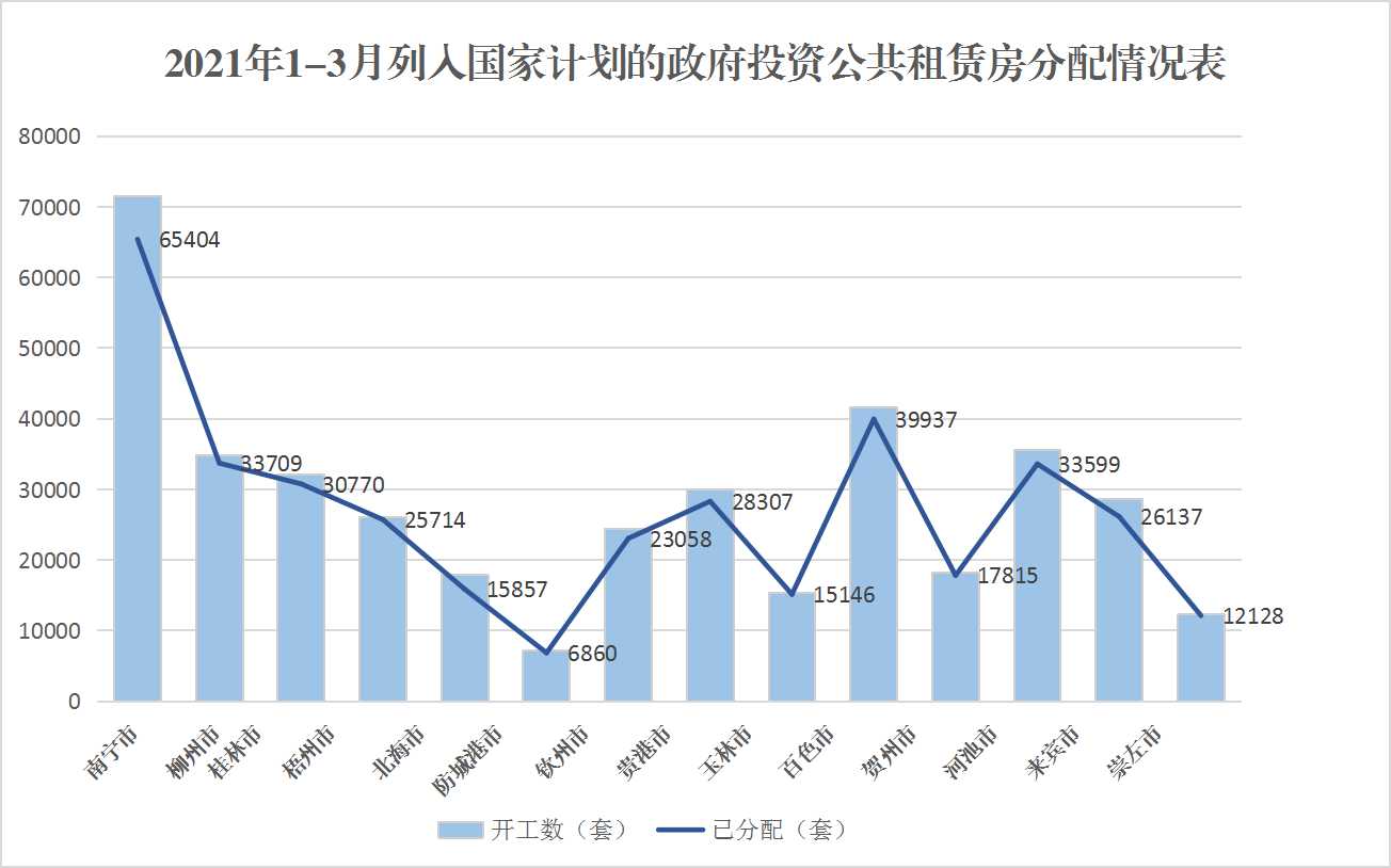 (一)全区公共租赁住房筹集情况。2021年,南宁、桂林和北海市计划筹集公共租赁住房5570套。截至3月底,已开工600套,完成年度开工任务的10.77%。