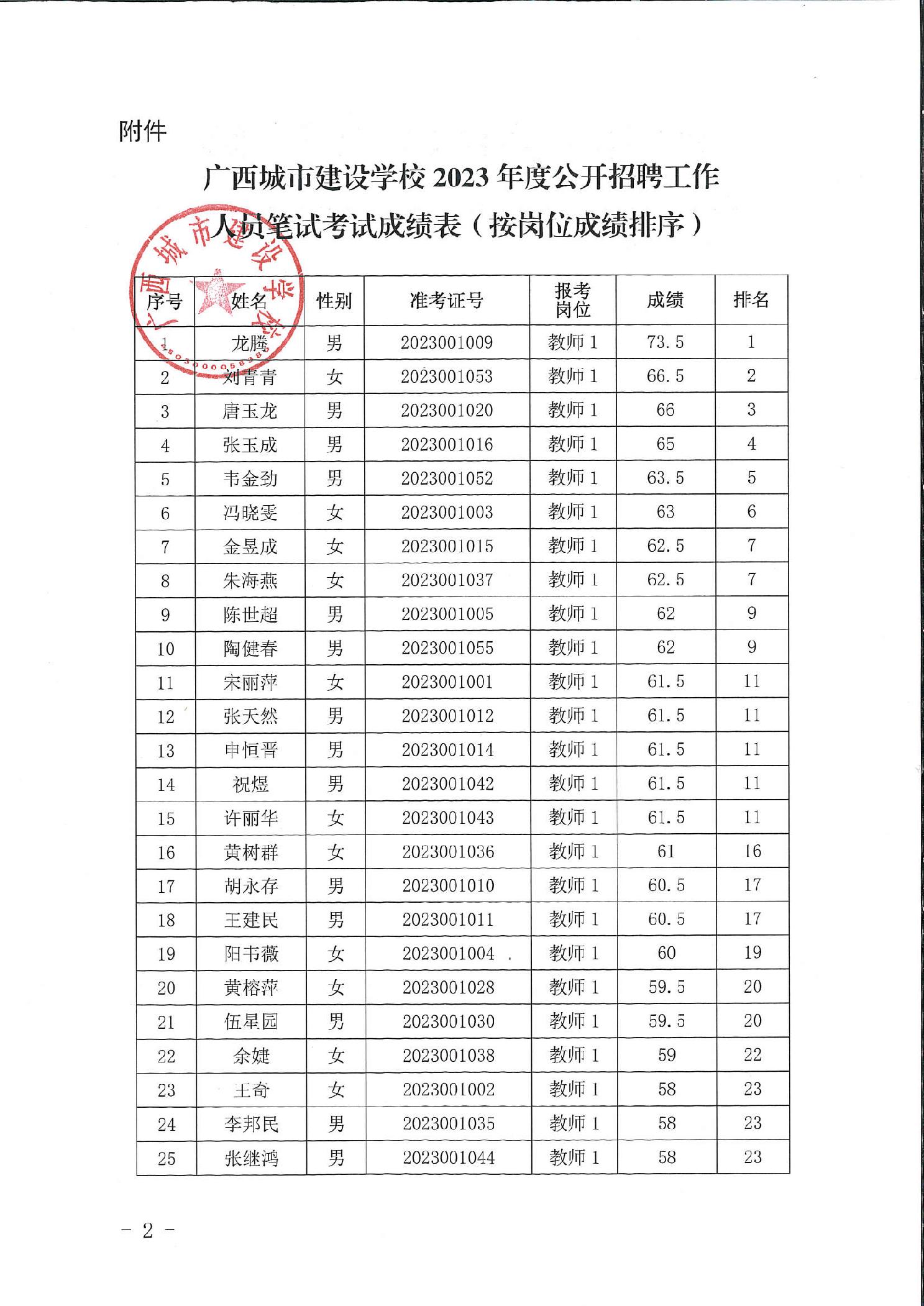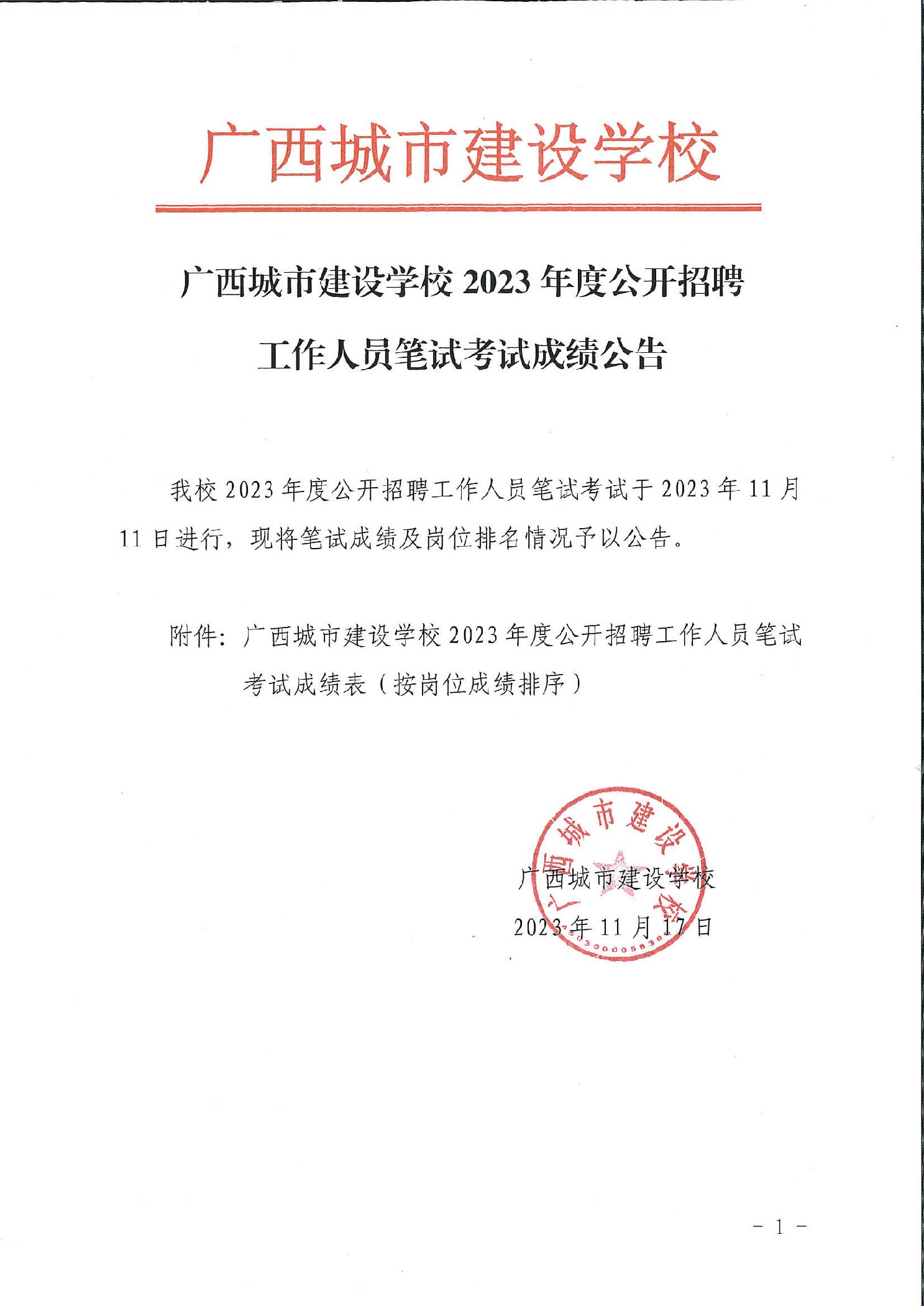 广西城市建设学校2023年度公开招聘工作人员笔试考试成绩公告