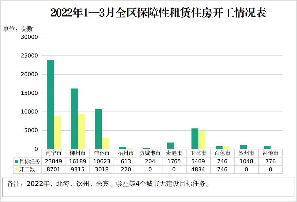 2022年,全区保障性租赁住房建设目标任务为6.13万套。截至2022年3月25日,已开工2.68万套,完成年度目标任务的43.79%。其中,建设进度较快的设区市有:柳州、南宁、玉林、桂林和百色市;尚未开工的设区市有:防城港、贵港、贺州和河池市。