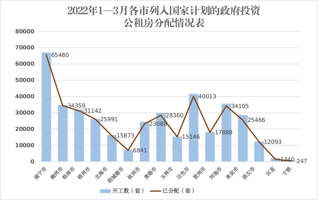 (一)全区公租房分配情况。截至3月25日,全区列入国家计划的公租房累计开工建设48.82万套(2015年以前开工建设46.97万套,2016-2021年开工建设1.89万套),已分配44.92万套。其中,列入国家计划的政府投资公租房累计开工建设40.33万套(2015年以前开工建设39.15万套,2016-2021年开工建设1.18万套),已分配37.74万套。各地公租房分配使用管理合理有序,但仍有个别项目存在空置现象,如:南宁市银凯工业园孵化一区110套住房因企业撤离腾退后空置;靖西市德爱保障性住房第二小区公租房项目188套项目于2021年建成,目前待分配。