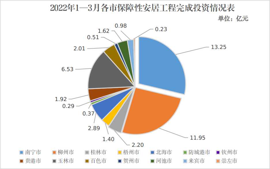 (一)全区棚户区改造新开工目标任务完成情况。2022年,全区棚户区改造目标任务为新开工10894套。截至3月25日,新开工2950套,完成年度开工任务的27.08%。其中,棚户区改造建设进度较快、开工量达500套以上的设区市有:柳州市(1221套)、南宁市(888套)和钦州市(675套)。