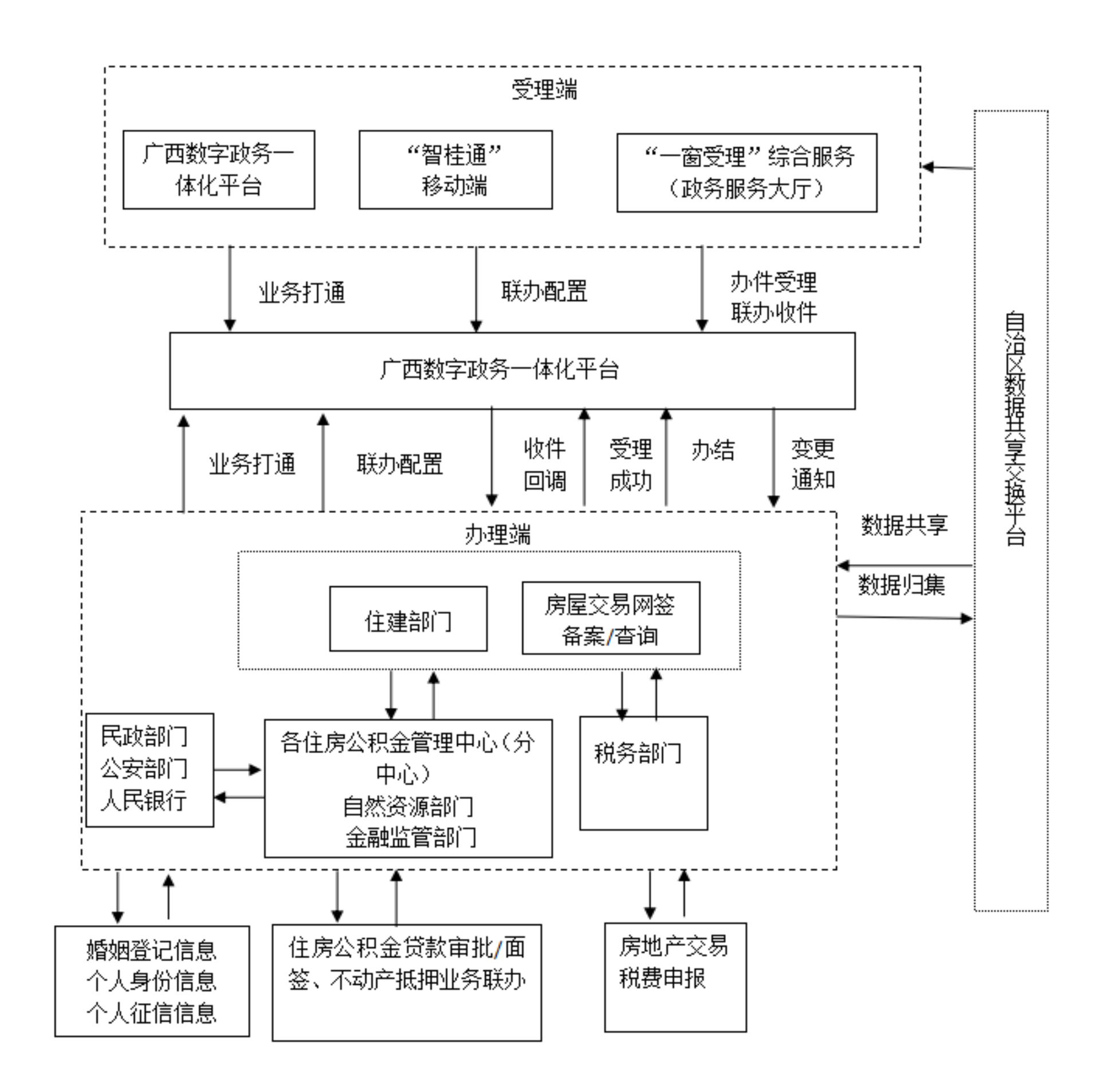 (四)推动实现跨部门跨区域数据信息共享。围绕住房公积金个人住房贷款购房“一件事”,实现自治区高级法院,自治区公安厅、民政厅、自然资源厅,人民银行广西区分行、广西税务局等部门之间的数据共享,通过自治区数据共享交换平台挂载房屋交易合同网签备案、贷款审批、房地产交易税费申报等信息数据共享接口,确保区内跨部门数据和材料流转。
