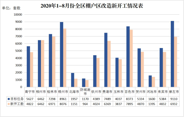 (一)全区棚户区改造新开工目标任务完成情况。2020年,国家下达我区棚户区改造目标任务为新开工6.985万套。截至8月底,全区已开工6.26万套,完成年度开工任务的89.64%。其中,柳州(100%)和玉林(95.05%)2市开工任务完成情况较好,开工率高于95%;河池(87.19%)、崇左(86.92%)、百色(86.63%)、南宁(85.69%)、贵港(85.04%)和防城港(82.39%)6市开工率低于90%,进展缓慢,未达全区平均水平。