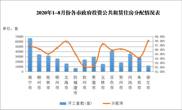 (二)全区公共租赁住房新增实物保障和基本建成目标完成情况。2020年,全区公共租赁住房新增实物保障任务为9553套,截至目前已完成9225套,完成比率为96.57%。其中,提前完成新增实物保障任务的设区市有百色、钦州、贵港、防城港、柳州和梧州市;完成比率低于30%的设区市有北海市(27.59%)和南宁市(12.13%)。