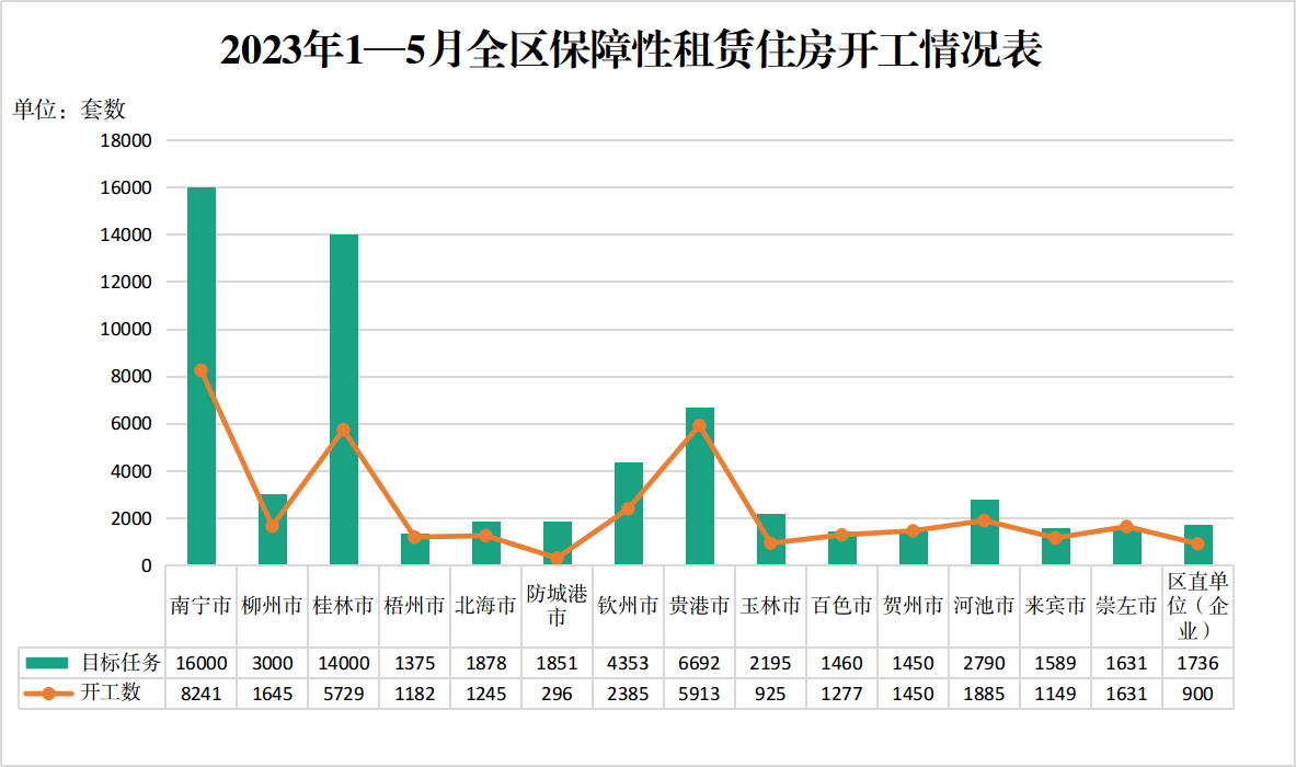 2023年,全区保障性租赁住房建设目标任务为62000套。截至5月25日,已开工35853套,完成年度目标任务的57.83%。其中,贺州市(开工率100%)、崇左市(开工率100%)、贵港市(开工率88.36%)等设区市建设进度较快;建设进度靠后的设区市为玉林市(开工率42.14%)、桂林市(开工率40.92%)和防城港市(开工率15.99%)。
