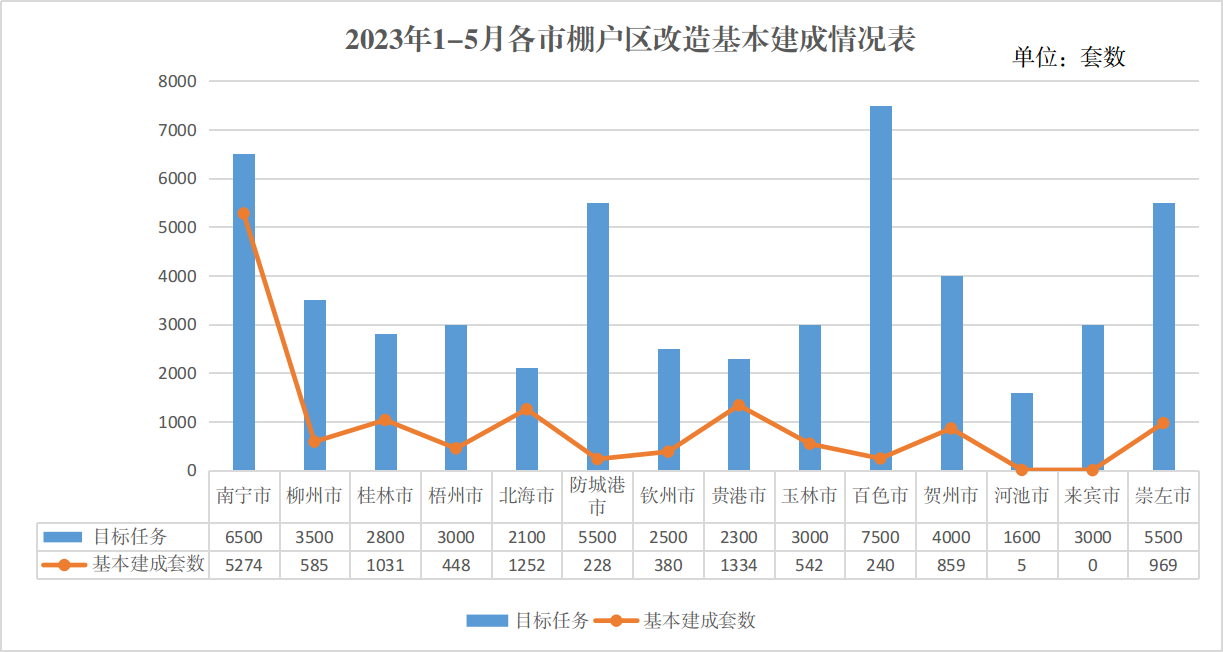 ⒈全区棚户区改造新开工目标任务完成情况。2023年,全区棚户区改造新开工目标任务为2230套。截至5月25日,已开工1274套,完成年度目标任务的57.13%。其中,柳州、防城港、玉林、河池市等设区市均已全部实现开工,桂林市开工率为44.1%,南宁市开工率为9.96%。