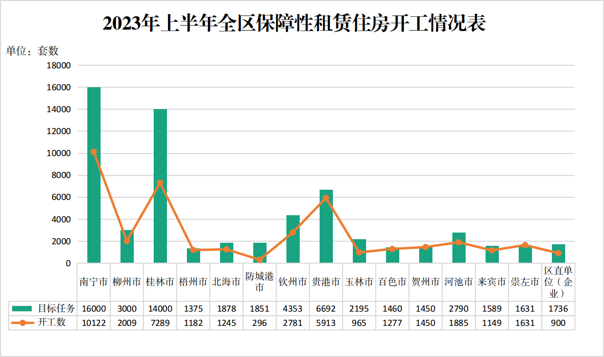 2023年,全区保障性租赁住房建设目标任务为62000套。截至6月底,已开工40094套,完成年度目标任务的64.7%。其中,贺州市(开工率100%)、崇左市(开工率100%)、贵港市(开工率88.4%)、百色市(开工率87.5%)、梧州市(开工率86%)等设区市建设进度较快;建设进度靠后的设区市为桂林市(开工率52.1%)、玉林市(开工率44%)和防城港市(开工率16%)。