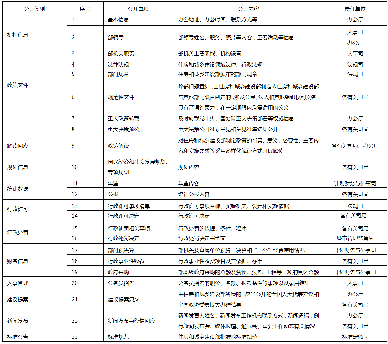 重点公开机构信息、政策文件、解读回应、规划信息、统计数据、行政许可、行政处罚、财务信息、人事管理、建议提案、新闻发布、标准公告等12类、23项内容。